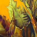 It was a few months after he passed that I was still having trouble getting back to my work. I went into my studio and was playing with some magazine pictures, placing them on my table in a ‘collage’ formation. I became enthralled with the composition and could see it no other way than as a painting. This became the beginning of the newest painting period for me – Wary of the Cassowary. If looking at the composition of the letters that are rising through the background – if sorted out they spell GENISIS – so it began. Two more paintings followed with a similar collage formation of images, whether from magazine images or a combination that included my own photos, as well. From there – after traveling to France and taking photos in Monet’s garden – came another direction of paintings that became my Giverny series. Objects of My Passion seems to be my next series as I embark on a series of my favorite shoes – there could be many!